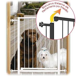 O sistema de travamento por pressão impede a abertura por crianças ou animais, garantindo a segurança do seu pet ou bebê. E quando acionado, permite a abertura completa da grade para ambos os lados, facilitando o acesso aos ambientes.
