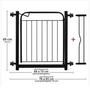 Observações Iniciais: Você pode utilizar o portão em duas opções de vãos: - Portão sem extensor: 69 cm à 74 cm - Portão com o extensor de 10 cm: 79 cm à 84 cm Indicado para: cães de pequeno, médio porte, e também para crianças. Não possui cantos vivos na estrutura o que promove mais segurança a seu bebe. Características Gerais: - Estrutura tubular reforçada; - Pintura com tinta epóxi a pó; - Instalação rápida e MUITO FÁCIL sem danos às paredes e sem furos; - Trava se segurança (evita que seu bebê ou cão abra com facilidade); - Abre para Ambos os Lados. Dimensões do Produto: - Altura 69 cm; - Largura:84 cm Sem Extensor (69 a 74cm) Com Extensor (79 a 84cm) - Distância entre as grades: 5 cm.