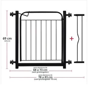 Observações Iniciais: Você pode utilizar o portão em duas opções de vãos: - Portão sem extensor: 69 cm à 74 cm - Portão com o extensor de 10 cm: 79 cm à 84 cm Indicado para: cães de pequeno, médio porte, e também para crianças. Não possui cantos vivos na estrutura o que promove mais segurança a seu bebe. Características Gerais: - Estrutura tubular reforçada; - Pintura com tinta epóxi a pó; - Instalação rápida e MUITO FÁCIL sem danos às paredes e sem furos; - Trava se segurança (evita que seu bebê ou cão abra com facilidade); - Abre para Ambos os Lados. Dimensões do Produto: - Altura 69 cm; - Largura:84 cm Sem Extensor (69 a 74cm) Com Extensor (79 a 84cm) - Distância entre as grades: 5 cm.