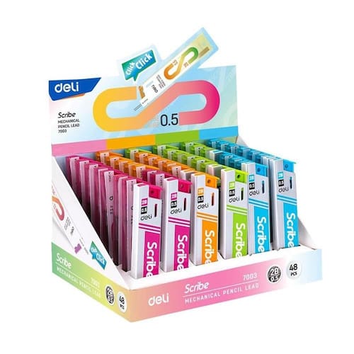 Características do Produto: Marca: Deli Modelo: 7003 Tipo de Produto: Grafite para lapiseira Espessura do Grafite: 0,5 mm Dureza do Grafite: 2B Quantidade: 20 minas EAN: 6921734944948
