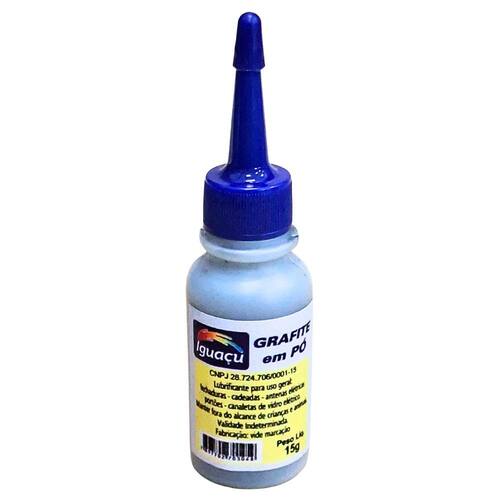 Grafite Em Pó Lubrificante Uso Geral 15g Grafite Em Pó Lubrificante Uso Geral 15g O grafite em pó é principalmente como lubrificante seco para reduzir o atrito em mecanismos, Especialmente em locais onde óleos e graxas são indesejados, como fechaduras, cadeados, trilhos E outras superfícies com movimento. Ele também pode ser para evitar o engripamento de parafusos e porcas em ambientes quentes. Mais detalhes sobre o uso do grafite em pó: Lubrificação: O grafite em pó forma uma fina camada que reduz o atrito entre as partes em movimento, facilitando o deslizamento e a operação. Em lugares quentes: O grafite em pó pode ser aplicado em parafusos e porcas em locais quentes como fornos e caldeiras, pois resiste ao calor E evita o engripamento. Em superfícies metálicas: O grafite em pó é eficaz em superfícies metálicas que precisam de lubrificação seca, como trilhos, guias e mecanismos de fechaduras, Evitando que as peças fiquem travadas. Outras aplicações: Além dos usos mencionados, o grafite em pó pode ser em outras áreas, como na lubrificação de canaletas de vidro E em máquinas industriais. Importante: O grafite em pó é um lubrificante sólido, ou seja, não é um óleo ou uma graxa. Ele forma uma camada seca que reduz o atrito e não deixa resíduos oleosos. Fabricante: Iguaçu