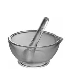Gral almofariz de vidro com pistilo 250ml Gral de vidro, utilizado em farmácias de manipulação e laboratórios que necessitam de moagem ou trituração de sais e substâncias químicas.