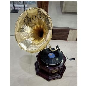 Acessório de música elegante para estúdio ou sala de estar, projetado exclusivamente para edição limitada. Tamanho 35,56 centímetros x 35,56 centímetros x 60,96 centímetros. Acabamento em latão e base de madeira marrom. Feito de latão e madeira de alta qualidade. Apresentando o elegante Gramofone Toca Discos Retrô com Trompa de Latão, da renomada marca THOR INSTRUMENTS. Este é um verdadeiro deleite para os amantes de música clássica e admiradores de designs vintage.