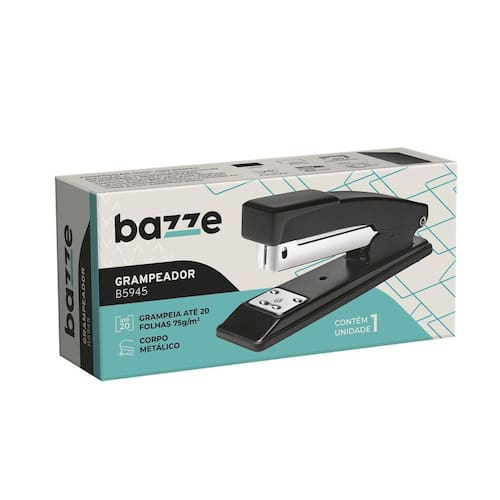 Cód: 2907 O grampeador B5945 possui corpo metálico Suporta 50 grampos 26/6 e 24/6. Grampeia até 20 folhas Cor preto. Ref: 614533 Marca: Bazze Marca: Não Informado Ean: 7897476614533