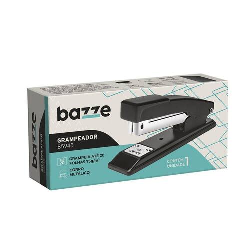 Cód: 2907 O grampeador B5945 possui corpo metálico Suporta 50 grampos 26/6 e 24/6. Grampeia até 20 folhas Cor preto. Ref: 614533 Marca: Bazze Marca: Não Informado