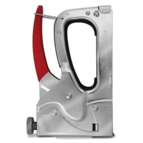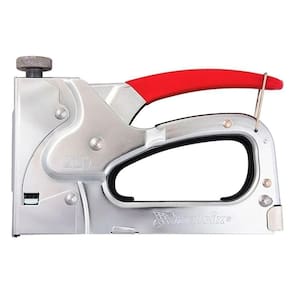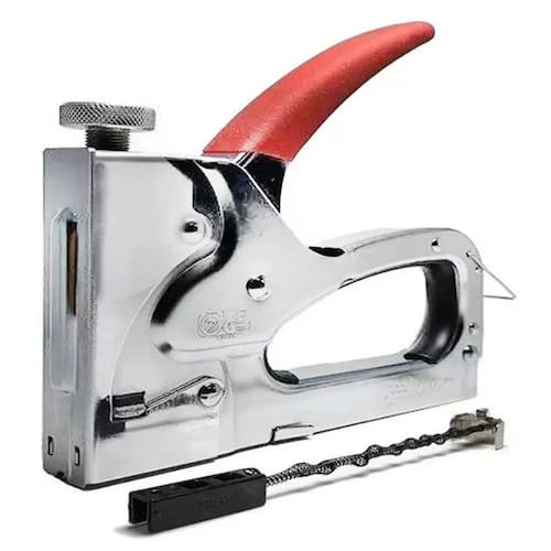 Grampeador manual possui mecanismo ajustável para controlar a força de impacto e profundidade.
