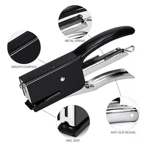 Grampeador metal tipo alicate; produzido em cabeçote e base em metal, com protetor plástico