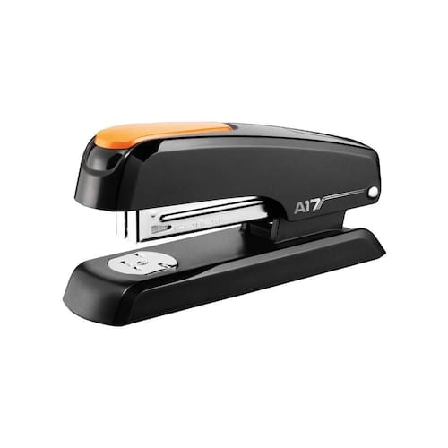 O grampeador de mesa A17 da Maped reúne funcionalidade, qualidade e resistência, com estrutura em aço polido, acabamento em plástico e apoios emborrachados que proporcionam conforto durante seu manuseio.