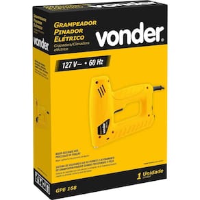 Grampeador / pinador elétrico GPE 168 127 V~ VONDER Proporciona maior agilidade nos processos de fixação. Possui sistema de segurança que só permite o acionamento do grampeador / pinador quando pressionado à peça, evitando disparos involuntários. Conteúdo: 1 Grampeador / pinador elétrico. Modelo: GPE 168 | Tensão (V): 127 V~ | Frequência (Hz): 60 Hz | Tipo e tamanho de pino indicado: Tipo "F" de 15 mm | Largura do grampo indicado: 11,3 mm | Altura do grampo indicado: 8 mm a 16 mm | Espessura do grampo indicado: 0,75 mm | Espessura do pino: 1,00 mm | Capacidade aproximada de grampos/pinos: 100 grampos / 80 pinos | Índice de proteção (IP): IP20 | Segue norma: IEC 60745-1 e IEC 60745-2-16 | Massa aproximada (peso) (kg): 1,2 kg