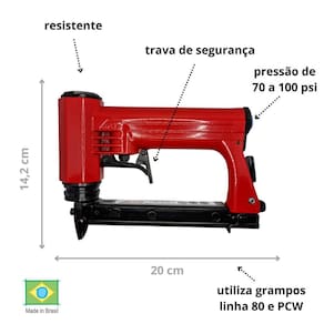 Grampeador pneumático pacar 80w tg Grampeador pneumático pacar 80w tg O grampeador pacar 80w tg é uma máquina 100% nacional, fabricada com os maquinarios mais modernos e 100% testada. Resistente e de fácil manuseio. Aplicações: Tapeçaria, móveis, estofados, capotaria, silk screen, janelas, portas, caixas, artesanato, decoração, etc. Especificações: Altura: 142 mm Comprimento: 200 mm Largura: 40 mm Peso: 0,89 kg Capacidade: 140 grampos Pressão de trabalho min : 70 psi Pressão de trabalho máx : 100 psi Consumo de ar: 0,5 l/golpe - mantenha o grampeador constantemente lubrificado - utilize sempre o regulador e o lubrificador Utiliza grampos da linha 80 e pcw: - linha 80: 80/04; 80/06; 80/08; 80/10; 80/12; 80/14 e 80/16 - linha pcw: pcw 50/05; pcw 50/07; pcw 50/10 e pcw 50/13 Não acompanha o conector de engate ou de mangueira Se ficou alguma dúvida nossa equipe pode te ajudar, será um prazer responder a sua pergunta. Marca: Não Informado