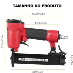 - marca: tesla store - referência: qs261 - para grampos de 10 a 22 mm - nome do produto: grampeador pneumático profissional grampos 10 à 22 mm f30 - modelo: máquina grampeador pneumático f30 - pressão operacional: 60 - 120psi max 4 - 8,3 bar - capacidade: 100 grampos - rápida fixação dos grampos - faixa de pressão operacional - 60 - 100 psi 0,4 - 0,7 mpa - dimensões da embalagem: 19 x 25 x 6 cm - material do produto: plástico, metal - cor: vermelho e preto Marca: Não Informado