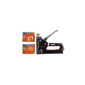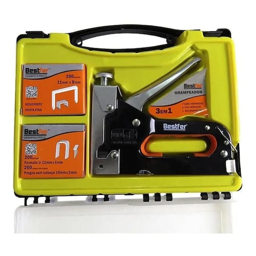 Grampeador Tapeceiro Madeira Profissional + Maleta + Grampos Amplamente utilizado em artesanatos, tapeçarias, telas de pintura, confecção de estofados, festas e fixação em geral de gramposAplica:- Grampos comuns de 4mm até 14mm;- Grampos formato U de 10mm até 12mm;- Pinos pregos sem cabeça de 10mm até 12mm.Tamanho aprox.: 14cm x 16cm x 2,5cmAcompanha:200 Grampos de 11x8mm;200 Grampos formato U de 12x6mm;200 Pregos sem cabeça de 10x2mm;1 Grampeador;1 Maleta para transporte. Marca: Não Informado