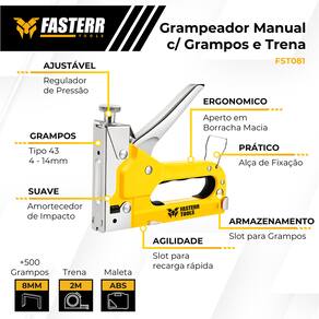 Indicado para tapeçarias, estofados, decorações, molduras, painéis e diversos projetos de fixação. Seja para uso ou doméstico, o Fasterr FST081 garante eficiência e ótimo acabamento.