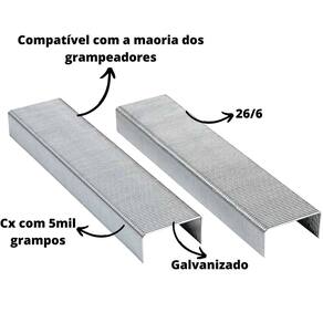 - Item indispensável para escritórios - Alta resistência e durabilidade - Feito com aço galvanizado, não sofre com oxidação - Tipo 26/6, suporta até 20 folhas - Validade indeterminada - Pacote com 5.000 unidades