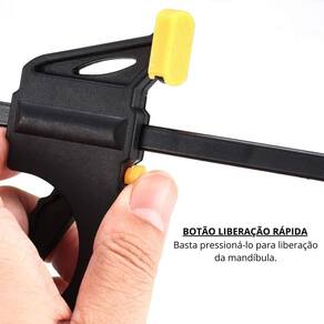 Tamanho: Disponível em diferentes medidas conforme necessidade. Material: Corpo em aço com empunhadura ergonômica em plástico reforçado. Sistema de Aperto: Mecanismo de liberação rápida para ajuste eficiente. Aplicações: Marcenaria, carpintaria, serralheria, bricolagem e fixação de peças diversas.
