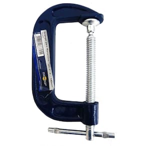 Grampo para marceneiro tipo 'C' 4pol 100mm, utilizado em processos de fixação, colagem e montagem de estruturas.