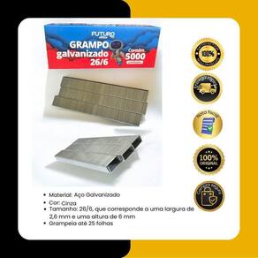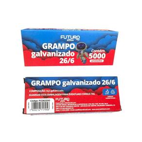 Kit 5 caixas com 5mil grampos em cada Grampo Galvanizado 26/6 Futuro O Grampo Galvanizado 26/6 - Futuro é uma ótima opção para quem precisa de um grampo de qualidade e durável. O grampo é feito de aço galvanizado, o que o torna resistente à corrosão e ao desgaste. Validade: Indeterminada Marca: Futuro Dimensões cm : 4.00 x 3.00 x 11.00 A x L x P Organização e Durabilidade com Grampo Galvanizado 26/6 - Futuro Sua Solução de Escritório Perfeita Resistência para o Dia a Dia Feitos de aço galvanizado, esses grampos são extremamente resistentes, resistentes à corrosão e ao desgaste. Ideal para quem valoriza produtos de longa duração e quer garantir que seus documentos estejam sempre bem presos. Praticidade e Versatilidade As dimensões compactas Confiança e Segurança Com a marca Futuro, você tem a de adquirir um produto desenvolvido para atender às suas expectativas de qualidade e desempenho. Garanta o Seu Agora Não perca a oportunidade de otimizar seu ambiente de trabalho. Adquira os grampos galvanizados 26/6 e experimente a diferença de um produto confiável e eficiente na organização de seus documentos. Marca: Não Informado Ean: 7794447677798