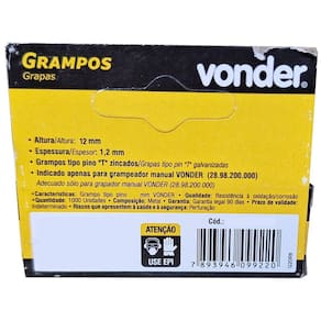 Grampo Pino VT 12 mm para Grampeador Manual 1.20 x 1.05mm 1.000 Unidades Vonder. - Marca: Vonder; - Referência: 28.98.612.000; - Altura do grampo: 12 mm; - Largura do grampo: 1,20 mm; - Medidas do arame: 1,05 mm; - Caixa com 1.000 grampos - Material do grampo: aço carbono - Tipo do grampo: Pino T - Possui acabamento zincado, proporcionando maior resistência à oxidação/corrosão - : 90 dias Indicado para o grampeador/pinador VONDER PLUS código 28.98.200.000. Os Pinos VT de 12 mm da Vonder são ideais para fixar materiais diversos, como tecidos, papéis, plásticos, madeiras e outros tipos de materiais. Se você trabalha com estofados, móveis, artesanato, construção civil, telas ou outras atividades que exigem uma fixação resistente e durável, esses grampos são uma excelente escolha. Com medidas precisas de 11,4 x 1,2mm, o Grampo Reto Vonder é fabricado em aço carbono com acabamento zincado, garantindo a sua durabilidade e resistência à oxidação e corrosão. Não perca mais tempo com grampos de baixa qualidade. Adquira agora os Grampos Retos Vonder de 10mm e tenha a tranquilidade de trabalhar com um produto de qualidade e resistência comprovadas. Economize muito no adicionando mais itens da loja ao seu carrinho - Leia toda a descrição e sintase a vontade de tirar suas dúvidas antes de comprar. - Precisa de um orçamento completo Nos mande sua lista completa por aqui que teremos o prazer de indicar ou montar um anúncio para atender a sua demanda com perfeição. Aguardamos seu pedido Muito Obrigado Marca: Não Informado
