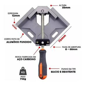Grampo sargento canto morsa angular 90º graus marceneiro aço Descrição Grampo sargento angular de marceneiro em alúminio fundido Informações importantes: Grampo angular para canto de 90º graus. Sistema de fixação com aperto de rosca. Indicado para diversos trabalhos na marcenaria e serralheria. Material resistente e de excelente qualidade e durabilidade. Pode ser com materiais de espessura de até 68mm. Especificações técnicas: Cor: cinza Material: alumínio fundido, aço carbono e borracha tpr Comprimento: 95mm Largura: 95mm Altura: 35mm Espessura: 12mm Faixa de aperto: 0 - 68mm Peso: 710 gramas do vendedor: 3 meses
