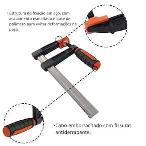 Fabricado em aço carbono, o Grampo Sargento Tipo F 80200 - Q0604- Fixman possui acabamento cromado no corpo e cabo emborrachado, proporcionando maior conforto durante o manuseio. Sua cor predominante é preto e laranja, conferindo um design moderno e diferenciado.