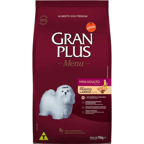 Ração Gran Plus Cães Adultos Raça Pequena Frango e Arroz - 15kg- Manutenção da saúde intestinal, com polpa de beterraba, prebiótico MOS e Extrato de Yucca; - Excelente absorção de proteínas, com ingredientes proteicos selecionados que proporcionam um bom aproveitamento para o organismo; - Mini partícula adaptada, Tamanho ideal da partícula que facilita a correta mastigação e preensão do alimento; - Ótimo funcionamento do organismo, com fonte rica em ômega 3 (EPA & DHA): nutrientes essenciais; - Satisfaz paladares exigentes, com ingredientes nobres de alta qualidade que proporcionam uma experiência de sabor para cães mini com paladares exigentes.