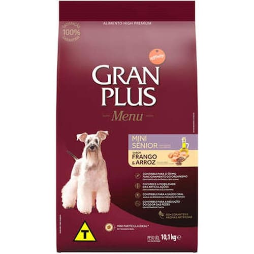 Ração Gran Plus Cães Adultos Sênior Mini Frango - 10,1kg- Saúde oral, com hexametafosfato de sódio, que auxilia na redução da formação do tártaro, e com partícula adaptada, que ajuda na preensão e mastigação do alimento; - Ótima mobilidade das articulações, com condroitina e glicosamina que auxiliam na manutenção das articulações do cão sênior; - Ótimo funcionamento do organismo, com fonte rica em ômega 3 (EPA & DHA): nutrientes essenciais; - Manutenção da saúde intestinal, com polpa de beterraba e pré-biótico MOS.