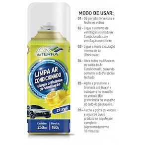 Ar da terra Limpa Ar condicionado é a formulação perfeita para eliminar o mal cheiro de seu sistema de ar condicionado. Com o Ar da Terra Limpa Ar condicionado você limpa e perfuma o sistema de ventilação de maneira simples, rápida e com excelente custo benefício. Esse produto tem um sistema simples de utilizar, funciona como uma granada, que deve trabalhar no interior do carro sem que haja ninguém dentro.