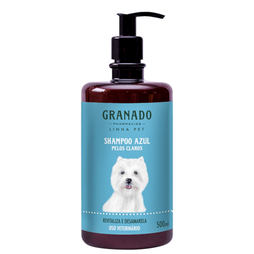 Shampoo azul para pets. Granado Pet é indicado para cachorros e gatos de pelos claros, auxilia na redução do tom amarelado.