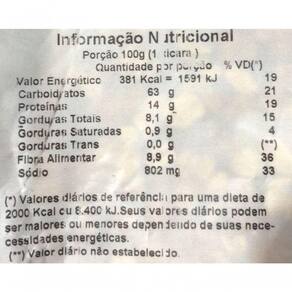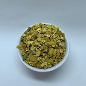 Aveia em flocos, flocos de milho sem açúcar, proteína texturizada de soja, semente de girassol(pepita), flocos de arroz, extrato de malte, lemon pepper, sal, semente de linhaça, castanha de caju, ervas finas, gérmen de trigo, amêndoas salgadas, açúcar mascavo, castanha do Pará, curcuma em pó.