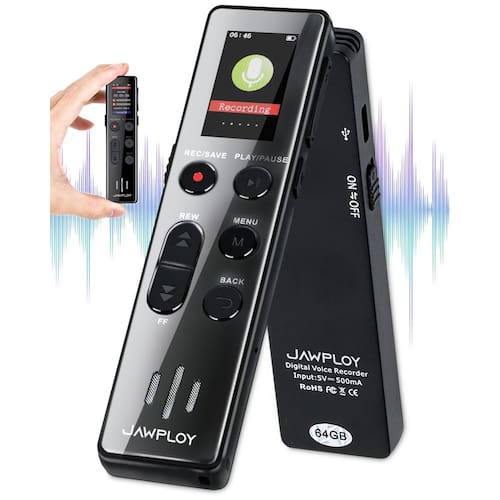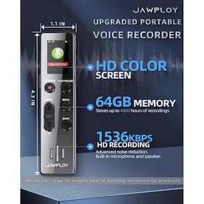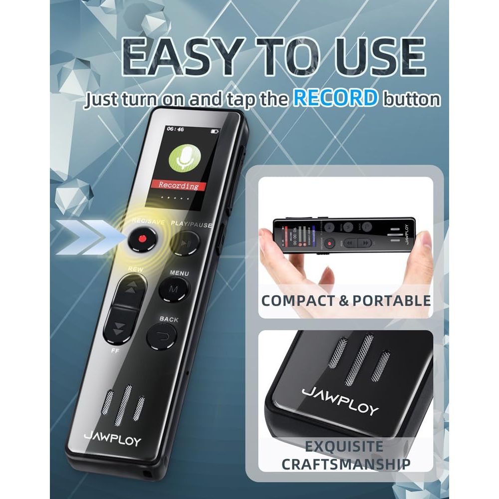 Características: - 64 GB de espaço de armazenamento. - Alto-falante embutido de alta qualidade. - Gravação HD de até 1536 kbps. - Gravação contínua de 20 horas com carga total. - Tecnologia profissional de aprimoramento de clareza de som. - Gravação ativada por voz. - Função MP3. - Repetição A-B. - Gravação com um clique. - Sistema operacional aprimorado. - Suporta vários idiomas. - Design portátil. - Transferência e carregamento de arquivos USB. - Gravação cronometrada. - Tela colorida e som claro: o gravador de voz Jawploy de 64 GB possui clareza de som avançada e um microfone de alta definição embutido, proporcionando gravações cristalinas de 1536 kbps. Adequado para palestras, reuniões, entrevistas, aulas e uso comercial - Amplo armazenamento: com 64 GB de memória, o gravador de voz portátil pode armazenar até 4400 horas de gravações. Suporta até 20 horas de gravação contínua com carga total e salva arquivos de forma inteligente antes de desligar quando a bateria está fraca - Gravação ativada por voz: ative o modo ativado por voz e pressione o botão REC. O gravador ativado por voz começará a gravar quando ouvir som e para quando estiver silencioso, economizando armazenamento e tempo. Pode ser definido com uma senha para proteger arquivos - Fácil de usar: com apenas três simples pressionamentos, você pode gravar, salvar e reproduzir. Suporta reprodução instantânea, repetição A-B, avanço rápido, retrocesso e exclusão. O gravador de voz Jawploy com reprodução também funciona como um leitor de MP3 e suporta vários formatos de música - Design portátil: pesando apenas 65 g e medindo 11 x 2,8 x 1 cm, este gravador de voz é leve e fácil de transportar. Os arquivos de gravação são nomeados por data e hora para facilitar o gerenciamento. Carregue e transfira arquivos facilmente através da porta USB tipo C
