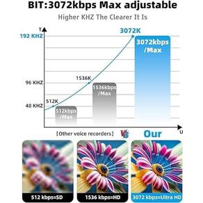 - ??Gravação máxima em HD de 3072 Kbps?O dispositivo de gravação com microfone minúsculo pode ajustar livremente o bit, incluindo 575 12 kbps/768 kbps/1024 kbps/1536 kbps/3072 kbps. Conheça seu requisitos para cada cena. Quanto maior o valor, mais claro é o som.