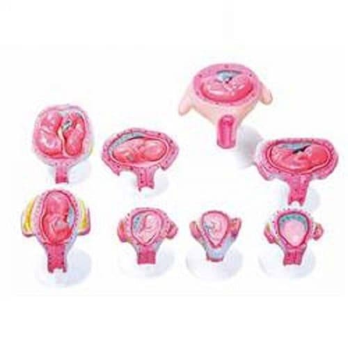 Desenvolvimento embrionário composto por oito modelos, confeccionados em material de semi-emborrachado, com suporte plástico, apresenta estrutura de embriões no útero durante os estágios da gravidez.