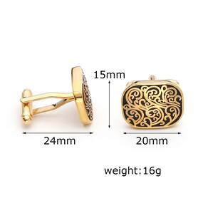 Material: cobre Tamanho: 24 mm × 15 mm × 20 mm Peso: 16 g Design elegante: essas abotoaduras apresentam um intrincado padrão gravado em preto em uma elegante base retangular banhada a ouro, oferecendo uma aparência vintage e sofisticada. Qualidade premium: feitas de cobre de alta qualidade, essas abotoaduras são duráveis e duradouras, mantendo um acabamento luxuoso. Estilo versátil: ideal para reuniões de negócios, casamentos ou qualquer ocasião formal, essas abotoaduras dão um toque refinado a qualquer combinação de camisa e terno. Ajuste perfeito: com um tamanho de 24 mm x 15 mm x 20 mm e um peso de 16 g, essas abotoaduras oferecem um ajuste confortável e seguro para todas as camisas com punhos. Apelo atemporal: se você está se vestindo para um evento especial ou procurando aprimorar seu traje profissional diário, essas abotoaduras são um acessório indispensável.