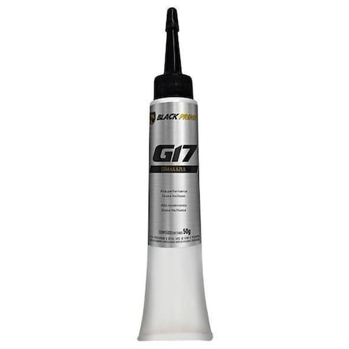 G17 - graxa azul black prime Sobre o produto Lubrificante de uso universal, especialmente formulada para rolamentos de rolos e . Contendo aditivos sintéticos que garantem o alto poder de resistência à oxidação e ferrugem. Indicado em diversos ramos da indústria. Devido a sua versatilidade é também utilizado na linha automotiva, principalmente em cubos de rodas dos veículos, juntas homocinéticas, tratores, colheitadeiras, debulhadeiras, onde requer uma lubrificação especial; É uma graxa superior as convencionais, aumentando a vida útil dos rolamentos e equipamentos lubrificados. Dados técnicos Cor: azul Temperatura de trabalho: -10ºc à 135ºc Consistência nlgi: 2 Ponto de gota: 180ºc Composição: óleo mineral, hidróxido de lítio, aditivos e corante. Marca: Não Informado
