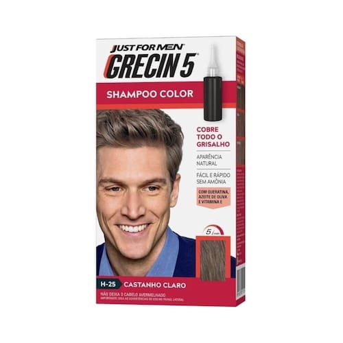 Grecin 5 Shampoo Tonalizante Castanho Claro 60ml DESCRIÇÃO: Sempre acompanhando as tendências, a Combe percebeu que há homens insatisfeitos com a quantidade excessiva de fios brancos e grisalhos, porém não querem tingir os cabelos. Para atendê-los e solucionar essa necessidade, a Combe desenvolveu o Grecin 5 Shampoo Color.AÇÃO/ATIVOS: O Grecin 5 shampoo color possui a inovadora tecnologia GTT (Grey Target Technology), que escurece apenas os fios de cabelos brancos mantendo sua cor natural. Foi especialmente formulado para escurecer exclusivamente os fios grisalhos, proporcionando um resultado natural. Você encontrará entre as diversas opções, um tom discreto que combina exatamente com a cor dos seus cabelos. Grecin 5 é um tonalizante que não danifica os cabelos pois não contém amônia. Além disso, sua fórmula é enriquecida com um complexo vitamínico natural que penetra nos fios de cabelo protegendo-os, tornando-os mais fortes e saudáveis.MODO DE USAR: Aplique sempre no cabelo seco. Se o cabelo for muito oleoso, lave-o e aplique o produto no dia seguinte para um melhor resultado - Não molhe ou lave o cabelo antes da aplicação. Passo 1: - Aplique a mistura nos cabelos começando pelas laterais ou pela região que tiver mais fios brancos - Espalhe nas demais regiões do cabelo, sem esquecer a parte traseira, cobrindo totalmente os fios. A aplicação não deve demorar mais que 3 minutos - Massageie como um shampoo, certificando-se de ter aplicado e espalhado uniformemente por toda extensão dos fios - Após fazer a mistura indicada no manual, comece a aplicação nas regiões da barba, bigode e costeleta, conforme desejar. Passo 2: - Espere agir por até 5 minutos ou menos se preferir um tom mais claro. Passo 3: - Adicione um pouco de água morna e massageie levemente até fazer espuma (o produto já contém shampoo e condicionadores) - Enxágue até que a água escorra totalmente limpa. Seque e finalize como de costume. Dicas: - Na dúvida sobre a cor, comece com uma tonalidade mais clara. Você facilmente poderá aplicar um tom mais escuro depois - Se quiser deixar um tom grisalho apenas nas costeletas, aplique por todo cabelo e por último nessas áreas, lavando em seguida - O tempo de espera determina a intensidade do tom, portanto quanto menos tempo esperar, mais clara será a cor - Para um tom mais claro, espere 3 minutos ao invés de 5 minutos e penteie a partir do 4 minuto. ESTE ANÚNCIO CONTÉM: 01 Grecin 5 Shampoo Tonalizante Castanho Claro 60mlGrecin 5 Shampoo Tonalizante Castanho Claro 60ml