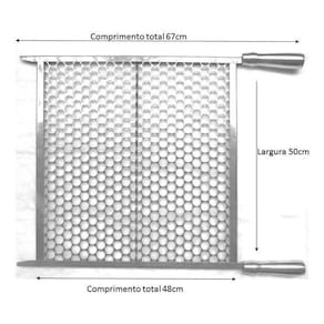 Produto de alta qualidade inteira em inox (tela e estrutura), não enferruja com alta durabilidade. A tela moeda tem 1,5mm de espessura, resultado de um produto resistente. E ainda acompanha suporte fixo para churrasqueira.