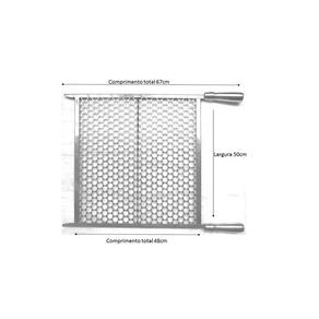 Dimensões e característica: Cabo de madeira revestido em alumínio Largura área grelha: 50cm Largura com cabos: 54cm Profundidade tela aprox: 50cm Profundidade total: 67cm da ponta ao cabo Peças suporte: 4 unidades de 8cm, 1 cavidade para barras de até 13mm. Tubos de aluminio: 1/2'' - 75cm - 2 unidades