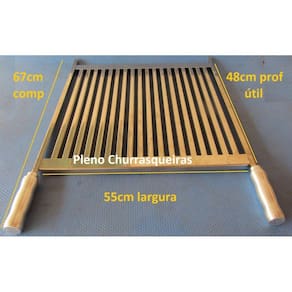 Descrição do produto : Material paletas e estrutura: inox 430 ; Paletas: fita de chapa curvada em formato u, soldada com a cavidade para baixo, superfície do grill plano Cabo: madeira revestida de alumínio . 55cm de largura x 48cm profundidade de área da grelha (67cm total comprimento contando com cabo, tem pontas para churrasqueiras de apoios nos fundos) . Altura: 1,8 cm, serve para churrasqueiras de trilho, verificar a altura do seu trilho antes de comprar.