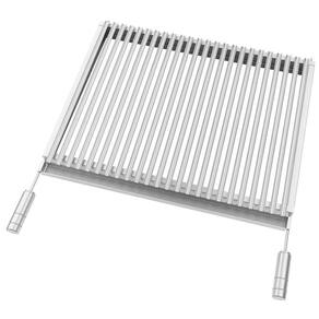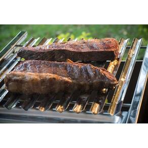 Grelha parrilheira, ao legítimo estilo argentino/uruguaio de churrasco, com canaletas inclinadas, recurso que permite o assamento de cortes nobres, mais próximos ao fogo, deixando a carne mais suculenta e macia. As canaletas inclinadas escoam a gordura da carne para o reservatório da grelha, impedindo que caiam diretamente na brasa, causando labaredas e fumaças.