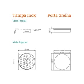 - Dimensões AxLxP (mm): - Porta Grelha: 22x100x100 - Grelha: 5x94x94 - Cor: Inox Polido - Material: - Porta Grelha em PVC - Grelha em Aço Inox 304 - Garantia: 5 anos junto ao fabricante - Referência: 5203 - Formato: Quadrado - Compatibilidade: Compatível com saída de 100mm e caixa sifonada - Sugestão de Uso: Ideal para salas de banho e banheiros em geral - Local de Uso: Interno O que vem na caixa: 1 Porta grelha de PVC 1 Grelha em Aço Inox 304