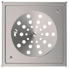 O conjunto de perfurações distribui a passagem de água e ajuda a evitar acúmulos na superfície, favorecendo a drenagem em chuveiros e áreas molhadas.
