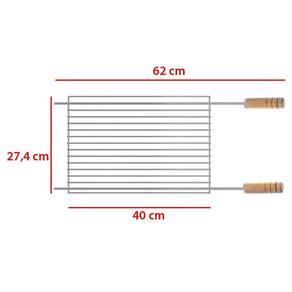 Componente exclusivo para as séries: Kit, Kit Suporte e Garden da Giragrill. Grelha Tradicional de arames da linha Inox, com proteção lateral para grelhar ou deixar espetos de churrasco em descanso na parte superior do kit. Cabos revestidos em alumínio. - Feita em aço inox, com cabos de madeira. - Muito resistente. - Grelha tradicional de arames com proteção lateral para grelhar ou deixar espetos de churrasco em descanso na parte superior do kit. CARACTERÍSTICAS Material: Estrutura em aço inox 304 e cabos de madeira marfim Peso Líquido: 1,52 kg Peso Bruto: 1,95 kg Medidas do Produto: C 62,0 x A 3,7 x P 27,4 cm Medidas da Embalagem: C 63,0 x L 28,0 x A 4,0 cm