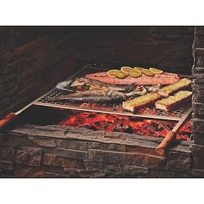 Ideal para grelhar frangos, peixes e legumes. Grelha com estrutura em aço inox. Cabos de madeira natural.