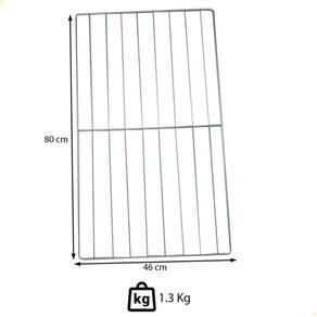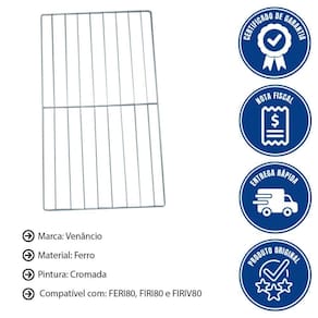 CARACTERÍSTICAS - Compatível com os modelo de fornos industriais da Venâncio: FERI80. FIRI80 e FIRIV80; - Material: Ferro; - Pintura: Cromada. - Garantia: 3 meses legal mais 3 meses pela fábrica. DIMENSÕES - Dimensões da grelha(LxP): 46 x 80cm