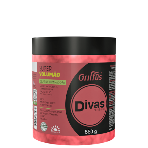 Gelatina iluminadora para cabelos ondulados, cacheados e crespos. Griffus Divas do Brasil Super Volumão é ideal para definir os fios com curvatura 2A a 4C.
