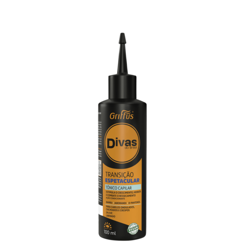 Tônico capilar para cabelos ondulados, cacheados ou crespos. Griffus Divas do Brasil Transição Espetacular promove o crescimento, elimina o ressecamento e hidrata as madeixas.