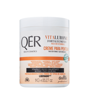 O Creme para Pentear Griffus QÉR Beauty Cosmetics Vitaluronic conta com ativos naturais e tecnológicos que proporcionam doze benefícios em um único produto. Sua formulação preenche as cutículas, previne o envelhecimento capilar, controla a queda e o enfraquecimento dos fios, trata o couro cabeludo, reduz o frizz e a porosidade, melhora a elasticidade, proporciona hidratação duradoura, possui efeito antipoluição e antioxidante e doa brilho aos fios.