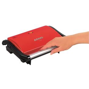 Grill Arno Compact Uno 760W com placas antiaderentes, alça fria, trava lateral e luz piloto. Ideal para grelhados saudáveis e práticos.Termostato regulável