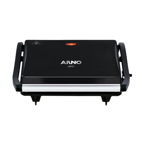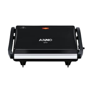 Grill compacto Arno com placa antiaderente, formato grelha, placa superior ajustável, alça permanente e fria, trava lateral para fechamento seguro e luz indicadora de funcionamento.Termostato regulável