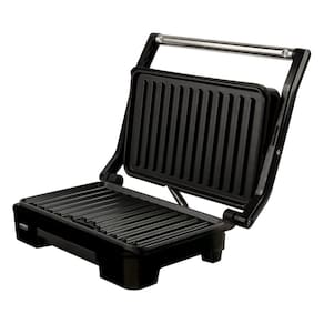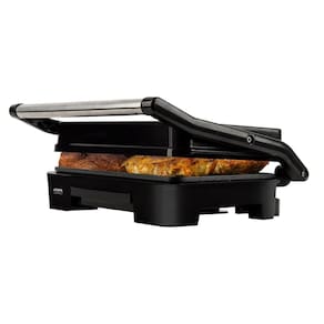 Grill elétrico multifunções Mallory Asteria Compact com placas ajustáveis, acabamento em aço inoxidável, luzes indicadoras, coletor de gordura integrado e alça com toque frio.Termostato regulável
